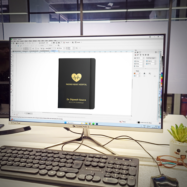 The final diary was more than just a notebook — it became a true reflection of Dr. Dignesh Vasava’s professional image. With a clean black cover and elegant gold embossing, it looked both stylish and serious. The hospital name and his medical title were printed clearly, adding a strong personal touch.